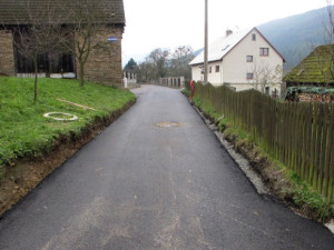 Oprava místní komunikace v zastavěné části obce – odstranění stávající konstrukční vrstvy, výstavba nové vrstvy a vybudování drenáže.